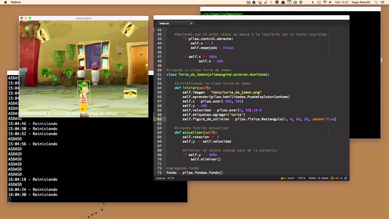 Con los niños estamos preparando un juego para mostrar las ventajas de PilasEngine en el proximo FLISoL y estoy trabado en algo, me gustaría que me ayuden, no logro hacer las colisiones entre las Tortas de Jamón y el Chavito por ende si no tengo eso el puntaje no aumenta, el código lo subí en github en el siguiente enlace